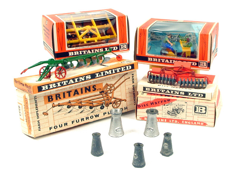 comprend : une charrue, un brise-mottes, une herse & un transplantoir - un modèle en état 'B' - on y joint 5 pots à lait