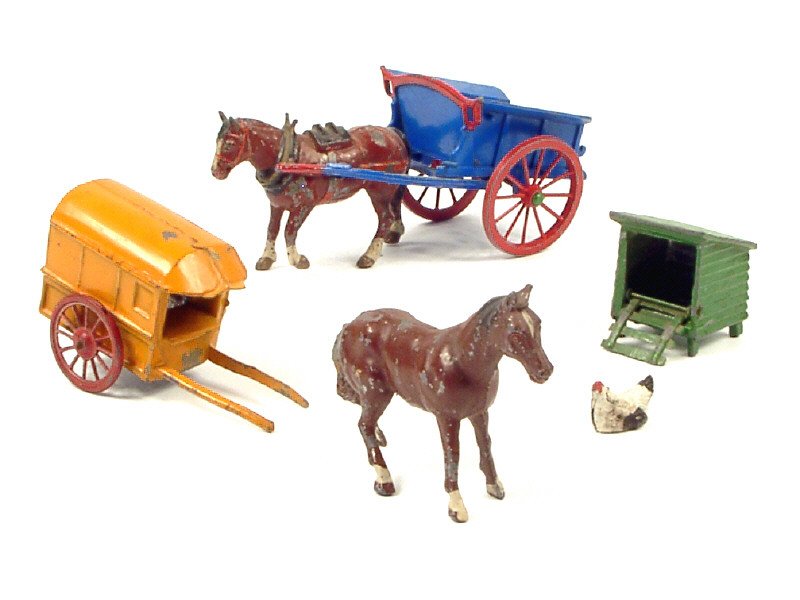 on y retrouve notamment les marques : CHARBENS, BRITAINS, FGT & JOHILLCO - une figurine en métal fatigue - manque une ridelle de charrette