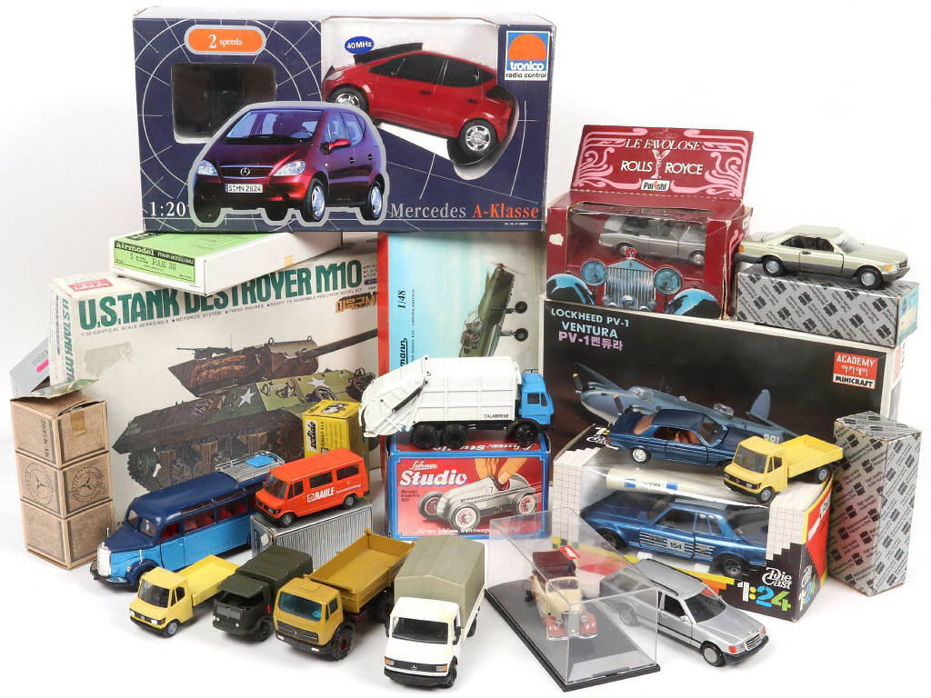 non testé - on y retrouve notamment les marques : SCHUCO, NZG & POLISTIL - possibilité de petits manques & parties cassées sur certains exemplaires - 4 exemplaires à monter (semblent complets) - les boîtes présentées sont en état 'b' & 'c' (certains exemplaires sans boîte)