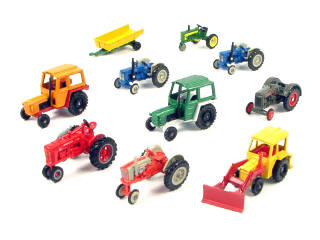 états de 'A' à 'B' - miniatures reproduisant les modèles : MASSEY FERGUSON, ZETOR, CASE, FORD, FARMALL, JOHN DEERE & FORDSON - on y retrouve les marques : ERTL & CORGI JUNIOR - une cheminée cassée sur un modèle