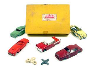 contient : une carrosserie de SIMCA CHAMBORD avec une partie de châssis, une partie vitrée (légèrement déformée), 5 pneus, une clef de montage & une notice - avec carton de fond de boîte & cale de protection - on y joint 4 carrosseries non conformes au coffret de FERRARI, CHEVROLET, PACKARD & FORD COMETE en état 'E'