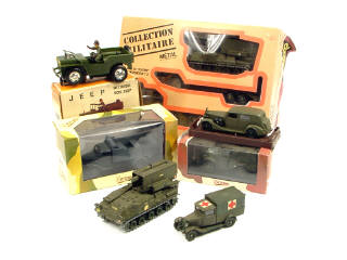 états de 'A' à 'B' - comprend : un BERLIET transport de char avec AMX 30 PLUTON, un DODGE WC52, une CITROËN C4F ambulance, un AMX 30 PLUTON, une JEEP avec moteur à pile, une PACKARD & un OPEL BLITZ - 6 engins avec boîte - petits manques sur 2 modèles - on y retrouve notamment les marques SOLIDO & VICTORIA
