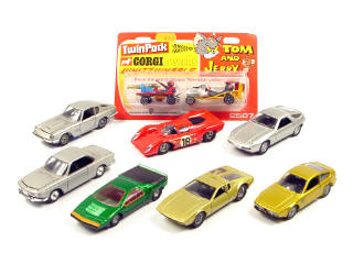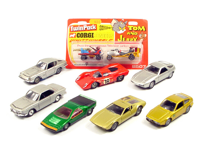 miniatures reproduisant les modèles : ALFA ROMEO, MASERATI, DE TOMASO, BMW, PORSCHE & FERRARI - on y joint 2 véhicules de dessin animé 'TOM & JERRY' de la marque CORGI JUNIOR sous blister jamais déballé