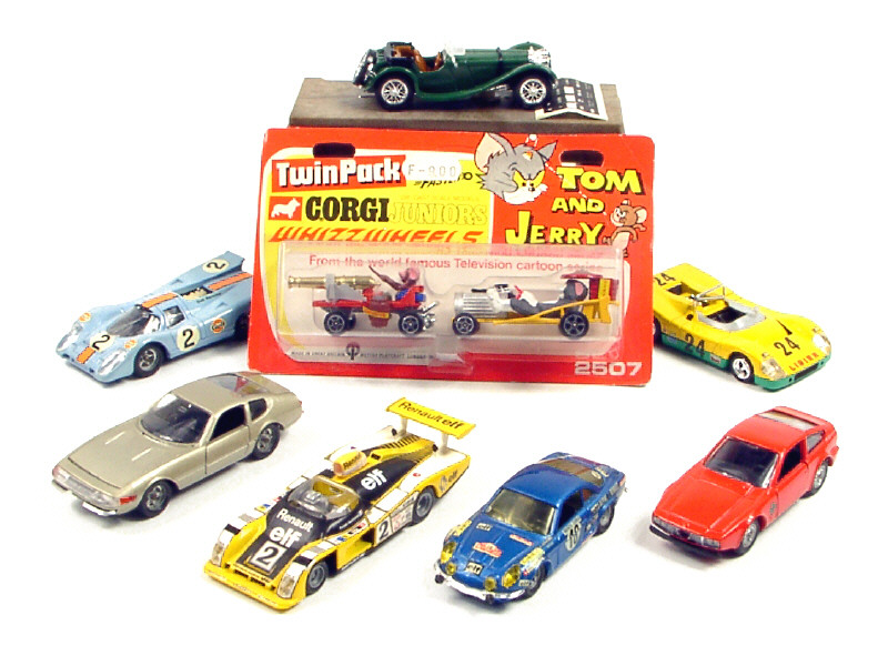 modèles reproduisant les modèles : ALFA ROMEO, ALPINE, PORSCHE, LIGIER, JAGUAR & FERRARI - on y joint 2 véhicules du dessin animé 'TOM & JERRY' de la marque CORGI JUNIOR sous blister jamais déballé