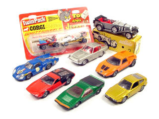 modèles reproduisant les modèles : ALFA ROMEO, DE TOMASO, MASERATI, MERCEDES & ALPINE- un modèle avec boîte - manque tableau de bord & volant sur une voiture - on y joint 2 véhicules du dessin animé 'TOM & JERRY' de la marque CORGI JUNIOR sous blister jamais déballé