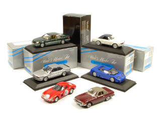 miniature reproduisant les modèles : MERCEDES, BMW, FERRARI & BUGATTI - on y retrouve les marques : MINICHAMPS & JOUEF EVOLUTION - 5 modèles avec boîte - vitrage d'un modèle légèrement déformé
