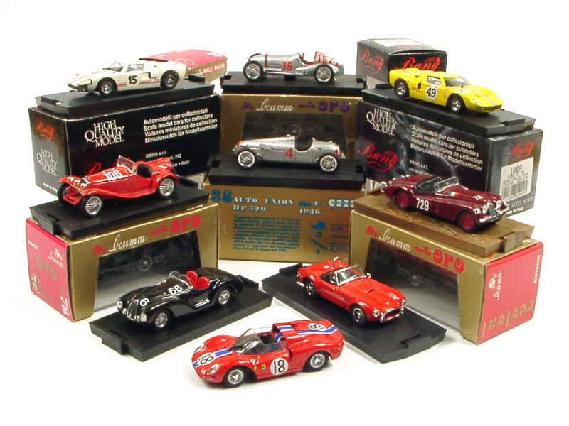 miniatures reproduisant les modèles : AUTO UNION, MERCEDES, FERRARI, FORD, JAGUAR, ALFA ROMEO & AC - on y retrouve les marques : BRUMM, BEST MODEL & BANG - un modèle sans boîte