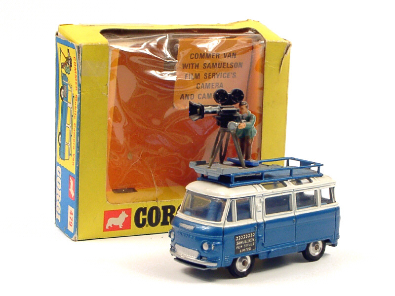 CORGI TOYS (GB) 479 COMMER Bus de reportage avec caméra bleu métal & blanc