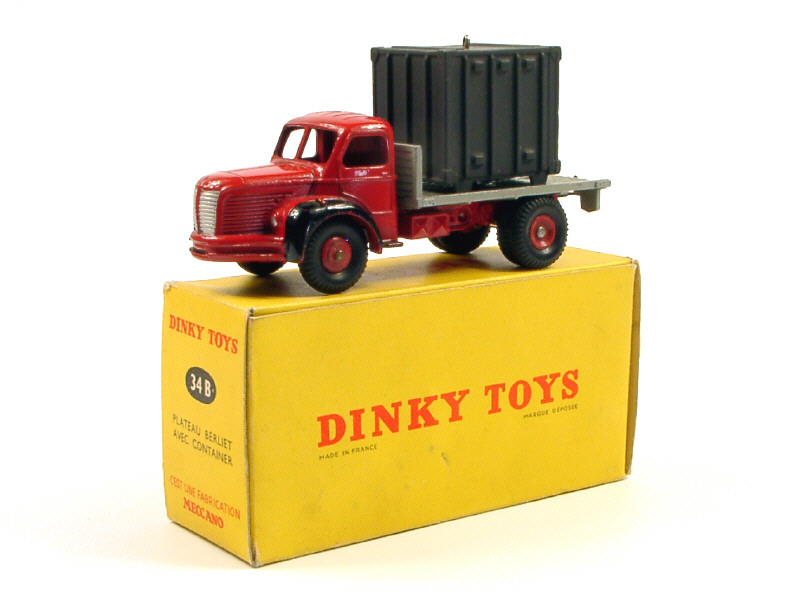 DINKY TOYS (FRANCE) 34B BERLIET Plateau avec container (version avec goupille) rouge, plateau gris clair