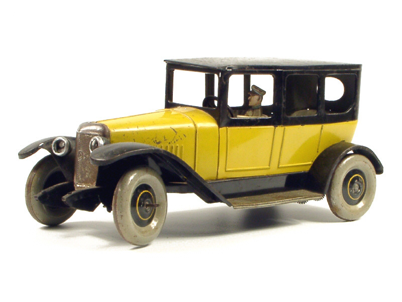 longueur 33 cm - fabrication de 1929-1934 - moteur à ressort (à revoir) - avec direction & chauffeur - phares non d'origine - manque un élément de direction - une roue & ressort de moteur ressoudés - BEL ASPECT GENERAL !