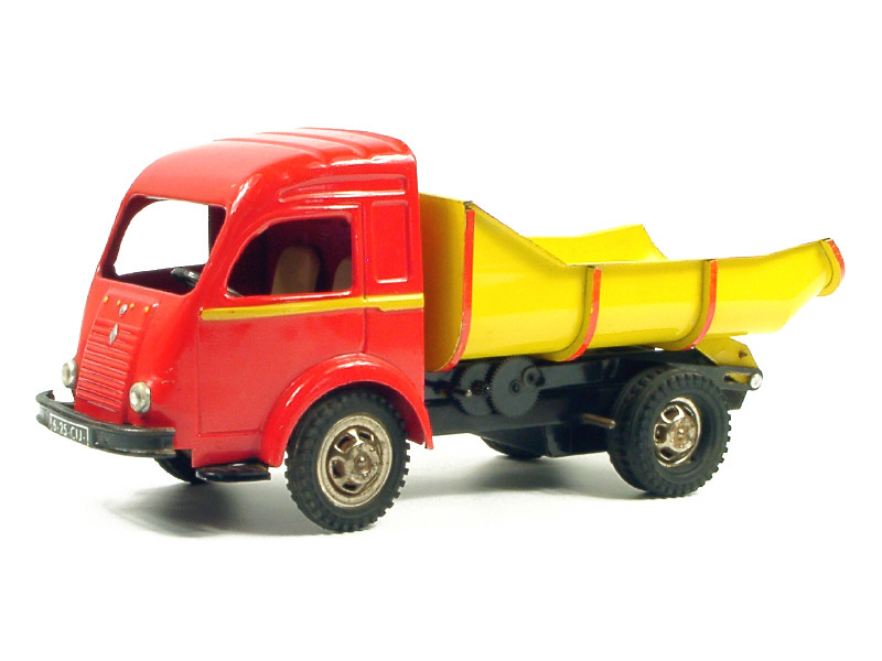 longueur 32 cm - moteur à clef (fonctionne) - avec direction & mécanisme de levage de la benne - modèle de 1960 - traces d'oxydation sur le moteur, les jantes & les axes de roues - petits manques sur le décalque de tableau de bord