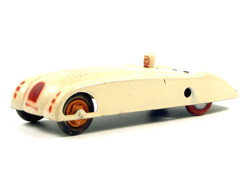 longueur 18 cm - moteur à clef (fonctionne) - version avec ailes avant échancrées, pneus en caoutchouc rouge MICHELIN (craquelés) & décalque de compétition n°6 à l'arrière - axe & roues avant non d'origine - traces d'oxydation sur le moteur & un axe de roues