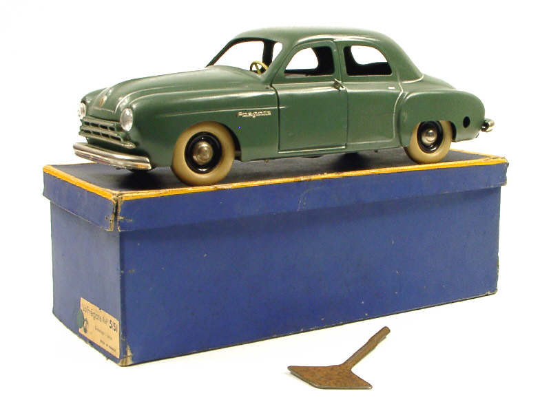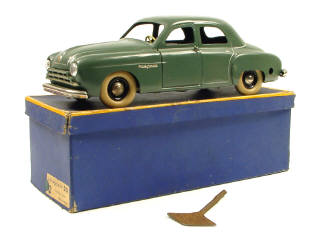 longueur 32 cm - moteur à clef (fonctionne) - phares électriques (à revoir) - calandre à 3 barres - porte conducteur ouvrante - avec clef & notice collée à l'intérieur du couvercle de boîte - légères traces d'oxydation sur le moteur - une ampoule de phare non d'origine