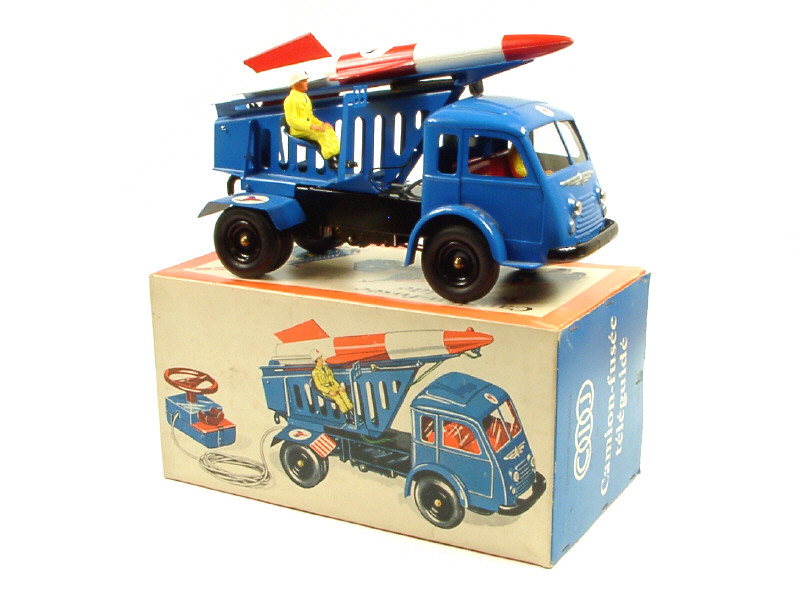 longueur 34 cm - moteur à piles (fonctionne) - la télécommande permet : la marche avant & arrière, la direction, la montée et la descente de la rampe de lancement - avec 2 personnages & feu lumineux de rampe - ce modèle est habituellement connu avec une cabine SAVIEM JM 240 - EXCEPTIONNEL !