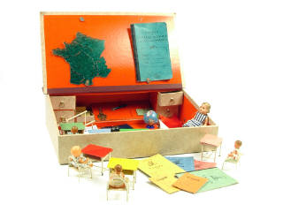 dimensions : 31,5 x 41 x 11 cm - contient une salle de classe avec personnages, tables, chaises, tableau, mappemonde & accessoires scolaires