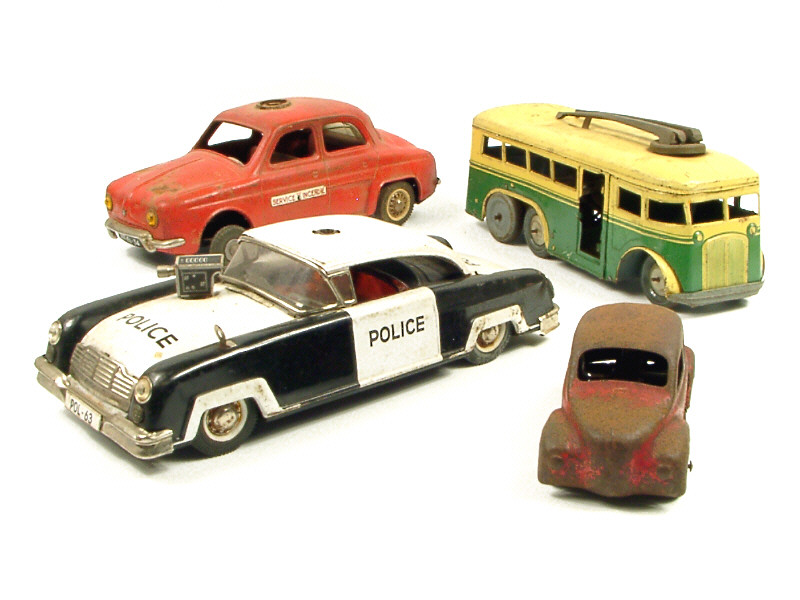 comprend : une voiture de police avec camera sur le capot, une RENAULT DAUPHINE de pompiers & une RENAULT 4CV - on y retrouve les marques JOUSTRA & C.I.J. - avec manques & traces d'oxydation