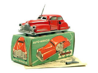 longueur 13,5 cm - moteur à clef (fonctionne) - en action, la voiture avance puis s'arrête tandis que la porte du conducteur & le capot s'ouvrent - elle redémarre en changeant de direction & les mouvements se répètent - avec notice & clef