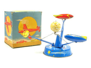 diamètre 30 cm - moteur à ressort (fonctionne) - en tôle lithographiée - en action, les 3 navettes spatiales tournent autour de la lune de haut en bas - boîte de la référence 1012