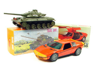 longueur 33,5 cm - moteur à piles (fonctionne) - avec direction par le volant - phares électrique - petit dépliant de la marque