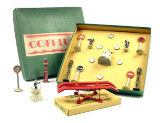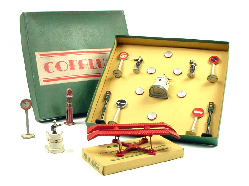 contient : 4 panneaux de signalisation, 2 feux tricolore, 3 agents de la circulation, 6 plots & une guérite de circulation - éléments fixés sur cale de fond de boîte & n'ayant jamais été utilisés - on y joint un pont de graissage avec boîte, une guérite avec agent, un panneau & une pompe à essence
