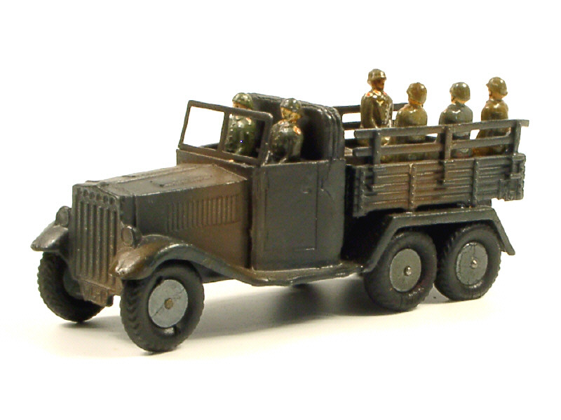 fabrication de 1937 - avec 6 soldats - quelques traces de métal fatigue - axes de roues arrière & plateau recollés - manque 3 supports d'axe de roues - traces de colle sous le plateau - SUPERBE !