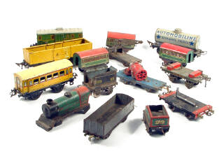 états de 'C' à 'E' - comprend : un wagon-tombereau à portes ouvrantes, un wagon-citerne 'AZUR', un wagon-grue, un wagon-plateau avec projecteur, un wagon-fourgon à bagages, 4 voitures de voyageurs de 2ème classe, un wagon-tombereau, 2 wagons-plateaux, une locomotive à vapeur avec tender & un tender - avec manques - on y retrouve les marques : JEP, CR & HORNBY
