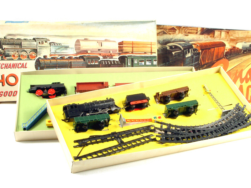 contient : une locomotive à vapeur type 030 avec tender, 2 wagons-tombereaux, un wagon-plateau à ridelles basses avec vigie, 2 signaux, 5 rails courbes, 3 rails droits & un aiguillage - un petit manque sur la locomotive