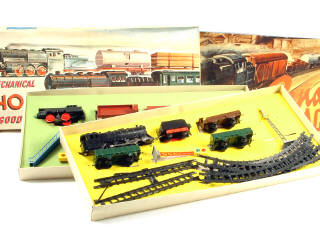 contient : une locomotive à vapeur type 020 (moteur à clef fonctionne), 2 wagons-plateaux à ridelles basses dont un avec vigie, un wagon-plateau, un signal, 7 rails courbes & une passerelle