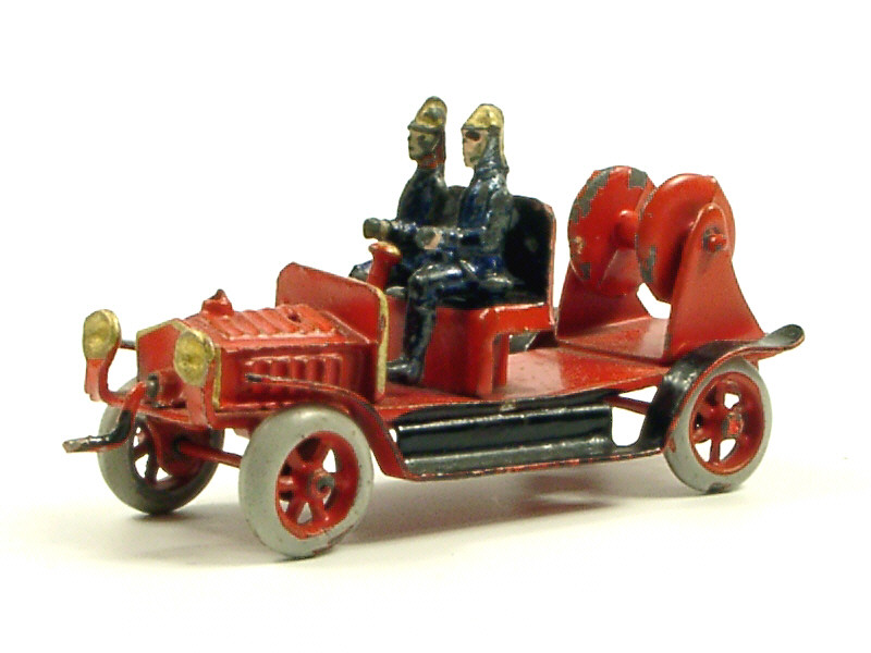 longueur 7,5 cm - fabrication en plomb de 1910 - avec 2 pompiers assis (demi-ronde bosse) - tuyau vraisemblablement manquant - SUPERBE !
