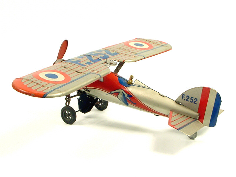 envergure 40 cm - moteur à ressort (fonctionne) - modèle produit de 1933 à 1955 - très légères traces d'oxydation sur les supports d'ailes & la clef - une petite soudure sous le fuselage non d'origine - SUPERBE !