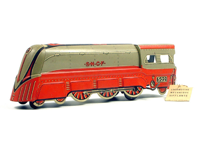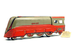 longueur 27 cm - moteur à ressort (fonctionne) - avec bruiteur - traces d'oxydation sur le moteur & un axe avec ses roues - avec étiquette d'origine 'LOCOMOTIVE MECANIQUE SIFFLANTE'