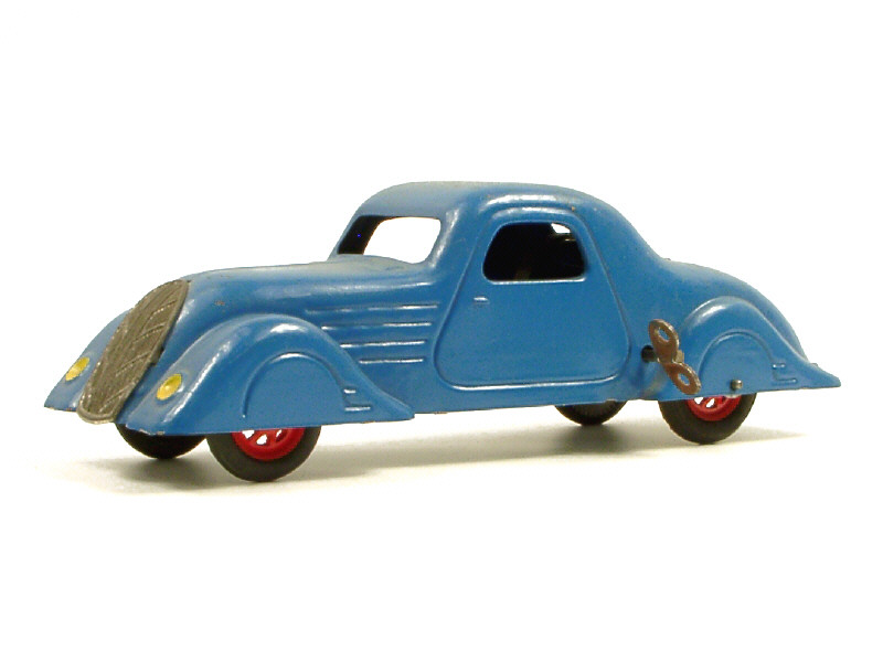 longueur 25 cm - moteur à ressort (fonctionne) - avec direction - fabriqué de 1935 à 1941 - 2 pneus craquelés - petites traces d'oxydation sur la clef - chrome de calandre terni