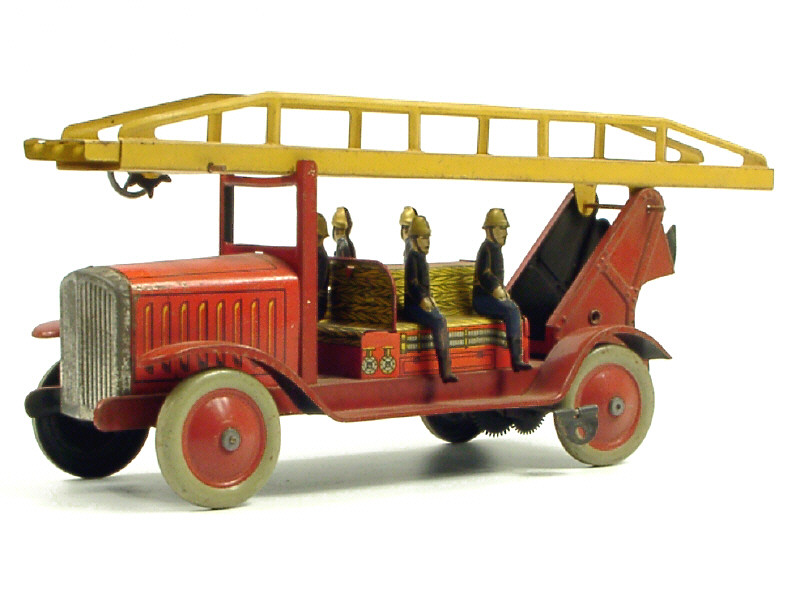 longueur 32 cm - moteur à ressort (fonctionne) - avec direction - 5 pompiers & 2 échelles présents - axes de roues & d'échelle oxydés - chrome de calandre terni - manque le volant - SUPERBE !