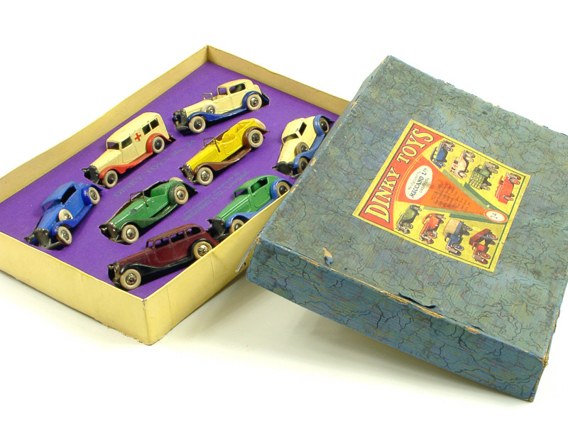 avec cale de présentation intérieure - ce coffret réunit la TOUTE PREMIERE SERIE 24 AVANT-GUERRE de 1934 - l'illustration du coffret comporte une étiquette collée indiquant la référence & les différents modèles contenus - un coffret similaire figurait page 42, dans le livre de Mike & Sue RICHARDSON 'LES DINKY TOYS ANGLAIS 1931-1979'
