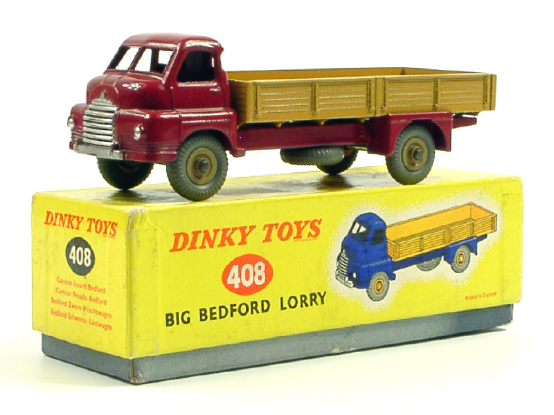 DINKY TOYS (GB) 408 BIG BEDFORD Plateau à ridelles bordeaux & ocre, jantes beiges
