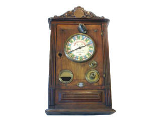 dimensions : 75,5 x 44 x 17,5 cm - corps en bois - le mécanisme fonctionne partiellement (une pièce coincée) - manque vitre de cadran & serrure de porte - BEL ASPECT !