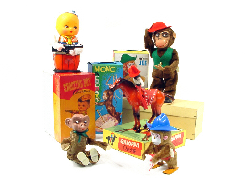 hauteur 13,5 cm - en plastique & tôle - moteur à ressort (fonctionne) - en action, le singe se balance en avant & en arrière