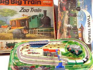 dimensions : 58 x 28 x 11 cm - contient : un circuit en plastique motorisé (moteur à pile fonctionne), 2 locomotives à vapeur, 2 voitures de voyageurs & 2 wagons à bennes basculantes