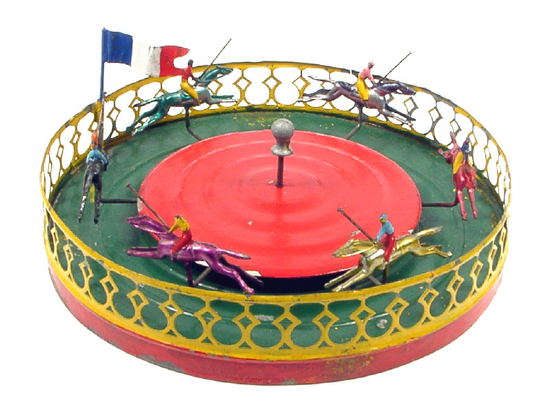 diamètre 27 cm - en tôle peinte - manque 2 têtes de jockeys - 2 fêlures sur la rambarde - quelques traces d'oxydation sous le plateau de jeu