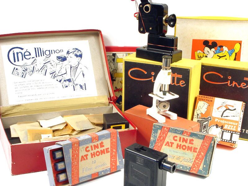 comprend : un coffret d'imprimerie 'MICKEY', un projecteur de cinéma 'BELL', 2 projecteurs de cinéma 'CINETTE', un microscope, un jeu d'assemblage en bois, 2 boîtes de pellicules pour projecteurs (une incomplète) & un 'CINE-MIGNON avec ses différentes vues