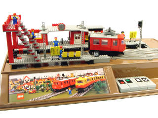 dimensions : 72,5 x 41 x 24 cm - représente une gare de voyageurs avec un autorail, différents accessoires & des personnages - manque 4 rubans anti dérapants de la motrice - moteur à pile (à revoir) - petites annotations sur l'emballage
