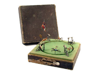 dimensions : 26,5 x 26,5 cm - mécanisme (à revoir) - un portique cassé - traces d'oxydation sur l'entourage métallique de la manette de fonctionnement