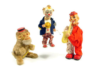 hauteur 25 cm - mécanisme à ressort (fonctionne) - en action, le clown fait tourner sa canne & varier sa hauteur - il remue la tête tout en reculant
