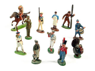 états de 'B' à 'R' - comprend : le général de Gaulle, 3 marins au défilé dont 2 trompettes, un fanfan avec sabre à l'épaule, un aviateur avec hélice, un indien sur son cheval, un officier des services de santé, un soldat au tambour, un soldat des services de santé & un dindon