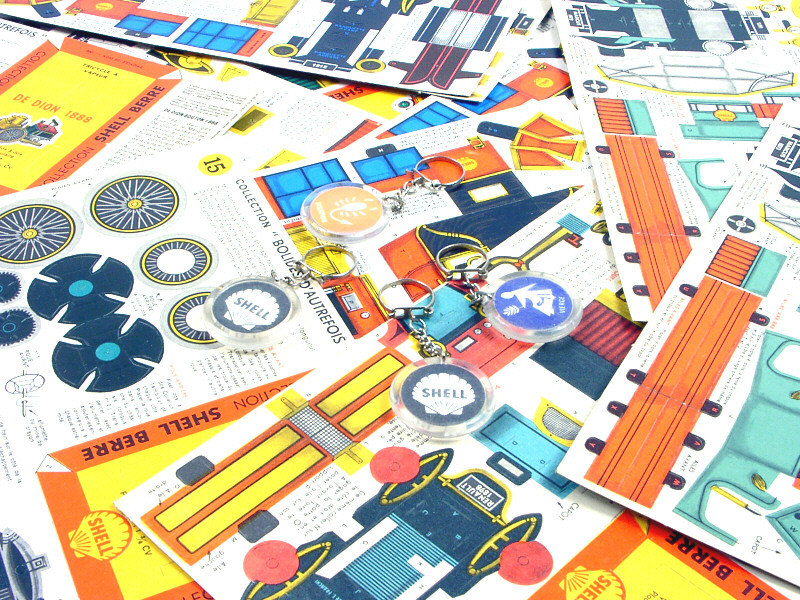 collection 'BOLIDES D'AUTREFOIS' - comprend les marques : PANHARD & LEVASSOR, RENAULT, ROVER, ROCHET-SCHNEIDER, DE DION, JEANTAUD, CADILLAC, MARCUS, RICHARD & SERPOLLET - ces montages étaient offerts dans les stations-services SHELL dans les années 60 - on y joint 4 porte-clefs de la marque représentant les signes zodiacaux du lion, de la vierge, du scorpion & du capricorne