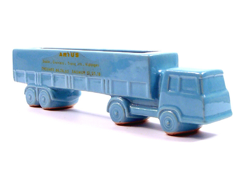 longueur 27,5 cm - en céramique - publicité 'ARTUS SABLE-GRAVIERS-TRANSPORTS-VIDANGES THOUARS 66-26-65 SAUMUR 51-25-18' - petits manques sur les publicités - ébréché