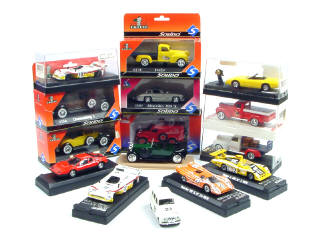 miniatures reproduisant les modèles : MIRAGE FORD, PORSCHE, ALPINE, CHEVROLET, HISPANO-SUIZA, FERRARI, DODGE, CORD, DUESENBERG, MERCEDES & RENAULT - un modèle sans boîte & un autre en état 'B' avec une porte manquante