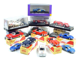 miniatures reproduisant les modèles : MERCEDES, ALPINE, FACEL VEGA, FORD, AC, LAND ROVER, CITROËN, ALFA ROMEO & PORSCHE - on y retrouve les publicités : HACHETTE & GUIDE DU ROUTARD - une boîte en état 'c' - 3 modèles sans boîte