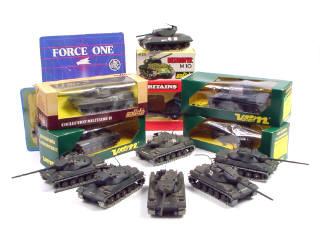 comprend : un LEOPARD, un AMX 13 105, un PANTHER PZ KW5, une KUBELWAGEN avec canon tracté, un DESTROYER M10, une JEEP avec dinghy sur remorque, 6 AMX 30T, un ABRAMS M1 & un canon en porte-clefs - 6 modèles sans boîte avec petits manques - on y retrouve les marques : SOLIDO, VEREM, BRITAINS, ERTL & BUCANERO - 2 modèles sous blister jamais ouverts
