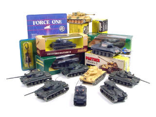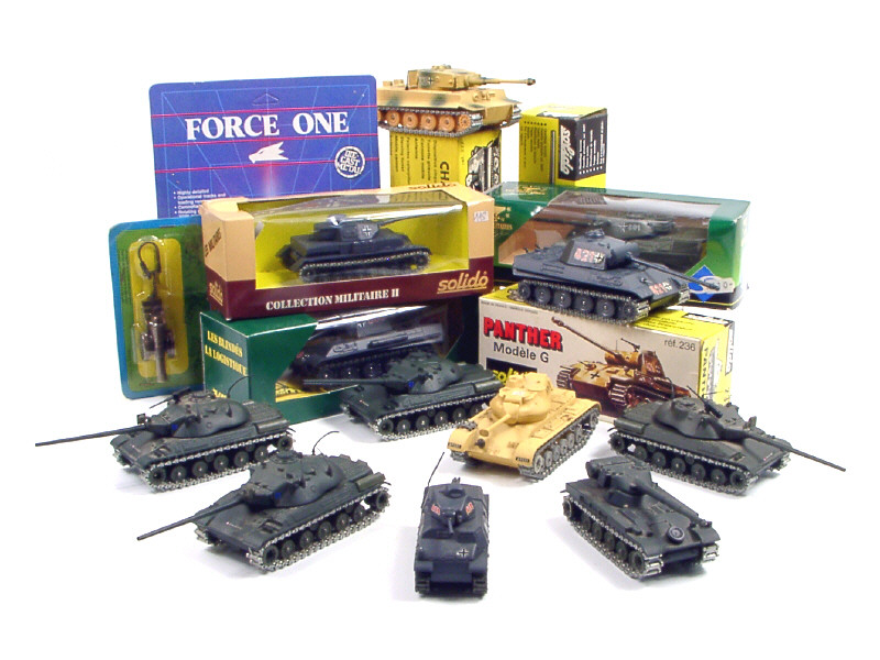 comprend : un TIGRE 1, un PANZER PZ KW5, un LEOPARD, un PANZER IV, un PANTHER G, 4 AMX 30T, un AMX 13T, un CHAR SOMUA, un GENERAL PATTON, un M113 transport de troupes & un canon en porte-clés - 6 modèles sans boîte avec petits manques - 2 modèles sous blister jamais déballés - on y retrouve les marques : SOLIDO, VEREM, ERTL & BUCANERO